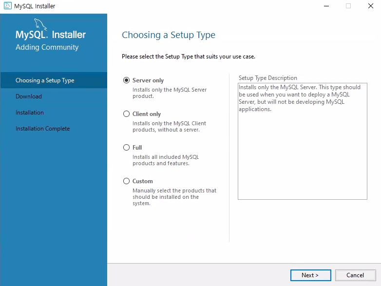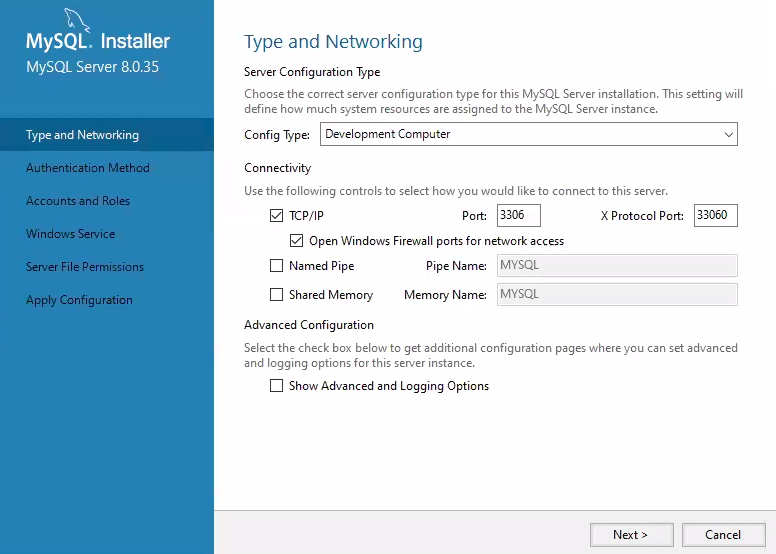 Confing Type (Development Computer), TCP/IP 체크, Port 3306 확인 → Next