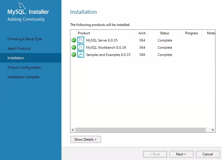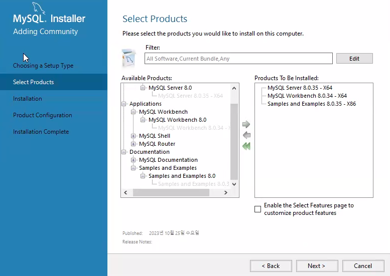 1)Available Products → MySQL Servers > MySQL Server → MySQL Server 8.0 > MySQL Server 8.0.35 - X64 > Products To Be Installed 환경으로 이동