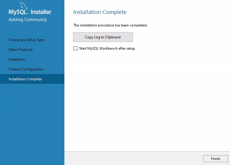 Start MySQL Workbench after Setup 체크 해제 → Finish